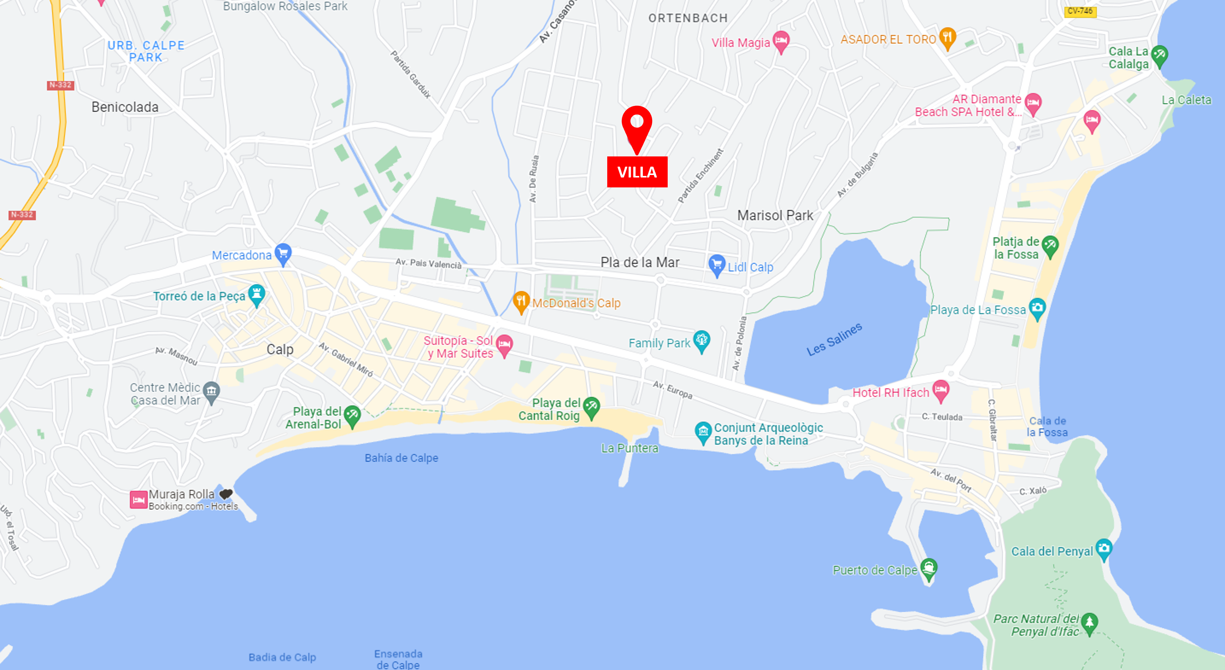 To allow you to optimally prepare your vacation, we provide you with the detailed villa location below. You will notice that it is a top-notch location: peaceful, yet still close to all required facilities and the lively center of Calpe!